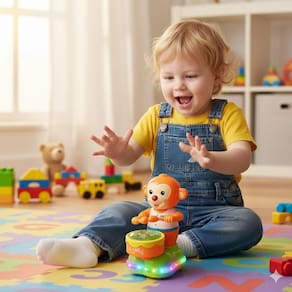 O macaquinho bate no tambor de forma rítmica, introduzindo o bebê ao universo da música.