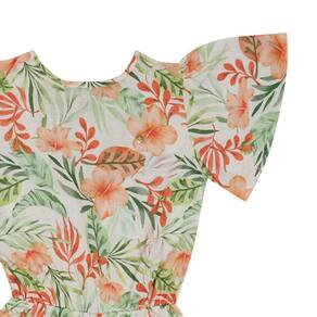 Versátil e rápido, lookinhos com macacão são apostas certeiras para as fashionistas irem brincar com a amiguinha no parquinho. Confeccionado em malha leve, o macaquinho na cor laranja possuí estampa sublimada de flores e folhas tropicais. O conforto, liberdade e leveza em uma peça! \n