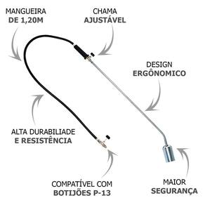 Informações Adicionais: - Marca: Max Chamas - Código Referência: 138096 - EAN: 7898130000747 - Comprimento do Maçarico: 1,20m - Comprimento da Mangueira: 1,20m Composição: Tubo de aço, polipropileno, latão, borracha trançada encapada e zamak
