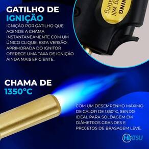 Este maçarico portátil é ideal para soldagem e brasagem em sistemas de encanamento, ar condicionado, aquecimento e refrigeração. Sua utilização é recomendada exclusivamente com gás Propano ou MAPP.