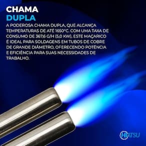 Com uma chama dupla potente, o maçarico alcança temperaturas impressionantes de até 1650C, combinando eficiência e rapidez com uma taxa de consumo de 367,6 g/h (5,0 KW). Essa característica torna-o perfeito para aplicações em tubos de cobre de grande diâmetro, onde a qualidade da soldagem é crítica, garantindo resultados consistentes e de alta qualidade.