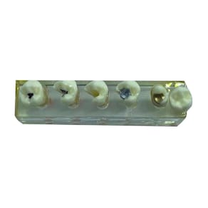 - Base de acrílico transparente: 2,9 cm de altura x 2,5 cm de largura x 10,5 cm de comprimento. - 5 Pré-molares de resina acrílica pintados, cada um medindo 3,8 cm de comprimento, 1,0 cm de largura e 1,3 cm de altura.