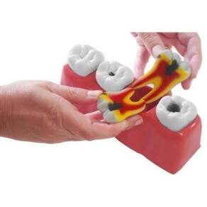 Base Plástica e Facilidade de Uso: O conjunto inclui uma base plástica rígida com dimensões de 25 cm x 8 cm x 8 cm, projetada para fornecer suporte estável e encaixe perfeito para os modelos dentários. Cada dente mede 9 cm x 5 cm x 4,5 cm e é encaixado individualmente na base, permitindo fácil remoção e recolocação para demonstração. Cada dente é dividido em duas partes, facilitando a visualização interna das lesões cariosas e a evolução da doença.