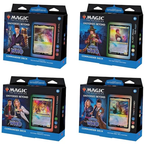 Com os decks Masters of Evil, Blast from the Past, Timey-Wimey e Paradox Power, você poderá reviver momentos memoráveis ??e explorar os personagens e lugares mais marcantes de Doctor Who enquanto enfrenta seus amigos em batalhas épicas de Magic.