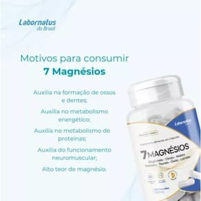 Nome do produto: magnésio 7 Suplemento: 7 tipos de magnésio Quantidade de cápsula: Tipo de cápsula: gelatinosa fácil absorção Miligramas por cápsula: 500mg Tipo de suplemento: alimentar Registro do produto: rdc notificação anvisa 243/2018 e 240/2018 Ingredientes: magnésio bisglicinato, citrato, malato, treonato, taurato, óxido e lactato Não contém: glúten, lactose, gordura trans, açúcares, sódio Modalidade da venda: unidade Rotulagem: todas as informações solicitadas pela anvisa Segurança: lacre interno e externo Embalagem: caixa protetora Origem do produto: nacional Marca: Não Informado