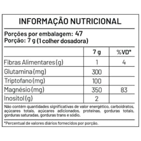 Magnésio Inositol + Glutamina e Triptofano O Magnésio Inositol é um suplemento em pó que traz praticidade ao consumidor, com sua forma desenvolvida por profissionais, com um sabor delicioso e refrescante de maracujá. Pode auxiliar no bem-estar diário. Com 4 fontes de Magnésio: Bisglicinato de Magnésio, Dimagnésio Malato, Taurato de Magnésio e Cloreto de Magnésio. Esse suplemento alimentar, pode te trazer muitos benefícios, sendo prático e fácil de consumir, e sendo um forte aliado para quem tem o estilo de vida vegano. Enriquecido com glutamina e L-triptofano para potencializar seus efeitos. Benefícios: Inositol é um suplemento de vitamina do complexo B A Glutamina é um aminoacido que auxilia na composição de proteína; O Triptofano é um aminoacido que pode beneficiar o humor, a boas noites e o apetite; 4 Tipos de Magnésio; O bisglicinato de magnésio pode ser indicado para a falta de magnésio por ser o mais completo dos magnésios; O Dimagnésio Malato é ideal para equilíbrio de proteínas, carboidratos e dos eletrólitos; O taurato de magnésio é um suplemento que tem ganhado atenção nos últimos anos por seus benefícios para a mente e o corpo; O Cloreto de Magnésio pode auxiliar na performance dos treinos. 100% Vegano; Não contém glúten; Não contém açúcar; Contém Glutamina e Triptofano. Sugestão de Uso: Diluir 7g 1 colher dosadora em 200ml de água ao dia, ou conforme recomendação profissional.