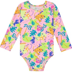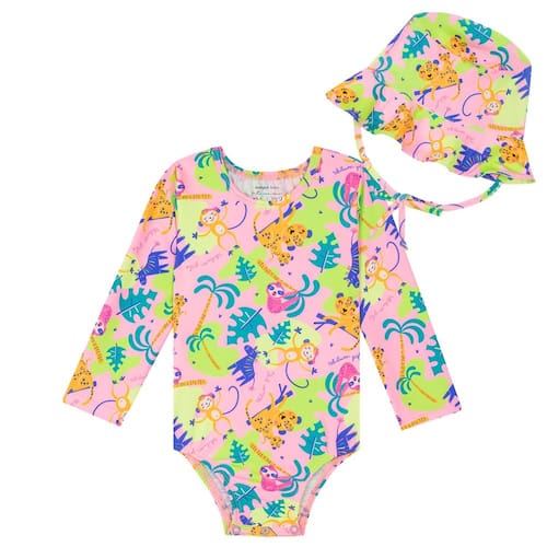 O Maiô para bebê Safari com proteção UV 50+ possui chapéu coordenado e é perfeito para as bebês. Em manga longa conta com estampa de simpáticos bichinhos e folhagens em tons de verde neon! Confortável, prático e seguro, ele é ideal para dias ensolarados na praia ou piscina, garantindo estilo e proteção para as pequenas. Possui botões entrepernas para facilitar a troca de fraldas e o vestir.