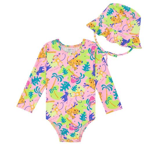 O Maiô para bebê Safari com proteção UV 50+ possui chapéu coordenado e é perfeito para as bebês. Em manga longa conta com estampa de simpáticos bichinhos e folhagens em tons de verde neon! Confortável, prático e seguro, ele é ideal para dias ensolarados na praia ou piscina, garantindo estilo e proteção para as pequenas. Possui botões entrepernas para facilitar a troca de fraldas e o vestir.