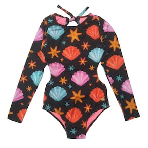 O Maiô Infantil Manga Longa para meninas com estampa de conchas Preto possui mangas longas para maior proteção e as brincadeiras na praia e piscina serem só diversão sem preocupação. O modelo é aberto nas costas e dos lados, e amarração na nuca.