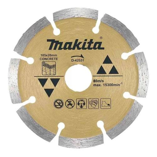 Makita D-42531 Discos Diamantado Seg 105x20mm Com 10 Unidades concreto CARACTERÍSTICAS: O disco diamantado para concreto com 105mm de comprimento e diâmetro do furo de 20mm modelo D-42531, recomentado para cortes em materiais mais rígidos como concreto, mármore entre outros. Disco segmentado para concreto, alvenaria, tijolos e telhas. Ean: 088381479226