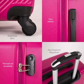Fabricada em ABS, esta mala é resistente e durável, equipada com 4 rodas 360° que proporcionam fácil manobrabilidade. Possui cadeado fixo com senha para segurança, carrinho com ajuste de altura para maior conforto e alças de mão e lateral (nas versões M/G). No interior, conta com cinta elástica e divisória em zíper para manter tudo organizado.