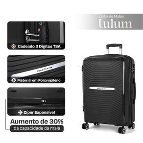 Qual é o material da mala A mala é feita de polipropileno, um material super resistente e inquebrável. Qual é a capacidade expansível da mala O zíper expansível aumenta a capacidade em até 30%. Quais são as dimensões da mala A altura é de 55 cm, a largura de 35 cm, e a profundidade de 25 cm. A mala tem algum recurso de segurança Sim, ela possui cadeado tsa de 3 dígitos para maior segurança dos seus pertences. A mala é fácil de transportar Sim, suas rodas duplas 360 e alça retrátil em alumínio com regulagem de altura proporcionam conforto e movimentação suave.