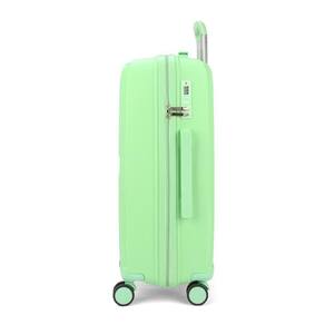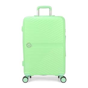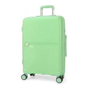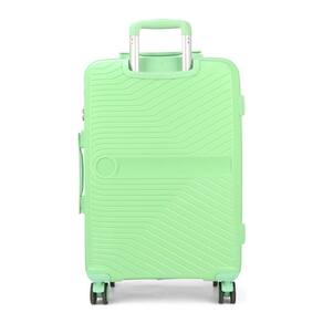 Fabricada em ABS de alta qualidade, a mala possui uma cor verde vibrante que se destaca. Sua alça de mão superior e alça retrátil de alumínio com botão liberador facilitam o transporte, proporcionando conforto e praticidade.