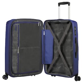 A Mala Grande Sunside Azul, da American Tourister, possui um amplo espaço interno forrado e é expansível, o que permite acomodar roupas, objetos, calçados e tudo que você precisar com praticidade.