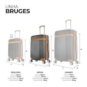 A mala média de viagem Bruges possui 66 cm de altura, 40 cm de largura e 24 cm de profundidade.