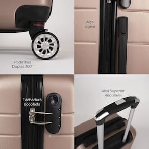 Fabricada em ABS, a mala média é resistente e durável, equipada com 4 rodas duplas 360° que proporcionam fácil manobrabilidade. Possui cadeado fixo com senha para segurança, carrinho com ajuste de altura para maior conforto e alças de mão e lateral. No interior, conta com cinta elástica e divisória em zíper para manter tudo organizado.