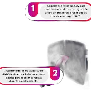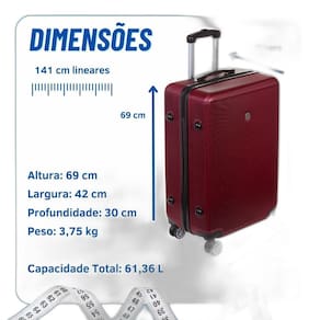 Marca: Sestini Tamanho: Médio Material: ABS Alça: De Mão Peso: 3,75 kg Capacidade Total: 61,36 L O que você recebe neste compra: 01 Mala Bordo 360 Dimensões: Altura: 69 cm x Largura: 42 cm x Profundidade: 30 cm. - Dia a Dia - Viagem - Trabalho - Férias - Todos os tamanhos possuem cadeado fixo de três dígitos, trazendo mais segurança para seus pertences. Internamente, as malas possuem divisórias internas, bolso com rede e elástico para segurar as roupas durante o deslocamento. de 3 meses contra problema de fabricação. As cores das imagens exibidas podem sofrer variações dependendo da tela em que são visualizadas.