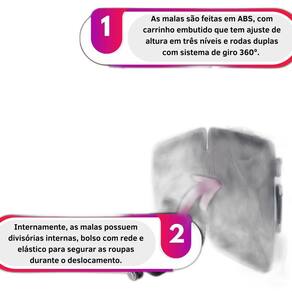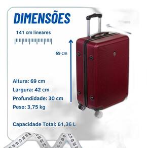 Marca: Sestini Tamanho: Médio Material: ABS Alça: De Mão Peso: 3,75 kg Capacidade Total: 61,36 L O que você recebe neste compra: 01 Mala Bordo 360 Dimensões: Altura: 69 cm x Largura: 42 cm x Profundidade: 30 cm. - Dia a Dia - Viagem - Trabalho - Férias - Todos os tamanhos possuem cadeado fixo de três dígitos, trazendo mais segurança para seus pertences. Internamente, as malas possuem divisórias internas, bolso com rede e elástico para segurar as roupas durante o deslocamento. de 3 meses contra problema de fabricação. As cores das imagens exibidas podem sofrer variações dependendo da tela em que são visualizadas. Marca: Não Informado