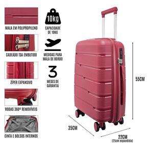 Características: - Mala rígida pequena (20") em polipropileno - mais durabilidade e segurança para sua viagem;- Rodas removíveis. Otimize o máximo sua bagagem sem se preocupar com as medidas de mala de bordo; - Cadeado TSA com segredo embutido; - Zíper expansor; - Forração interna acolchoada; - Alças flexíveis superior e lateral para maior conforto e comodidade; - Bolso interno com zíper; - Rodas duplas giratórias em 360º; - Carrinho retrátil com pintura eletrostática e botão liberador.