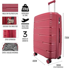 Características:- Mala rígida grande (27") em polipropileno;- Cadeado com segredo embutido;- Forração interna acolchoada;- Alças flexíveis superior e lateral para maior conforto e comodidade;- Bolso interno com zíper;- Rodas duplas giratórias em 360º;- Carrinho retrátil com pintura eletrostática e botão liberador. Medidas (LxAxP):Tamanho G: 49x73x25cm (28cm expandida)Peso: 3,9kg