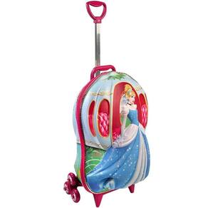 Mala Infantil MaxToy Princesa Cinderela Carruagem A Mochila 3D Maxtoy é feita de EVA de alta qualidade e resistência, oferecendo um corpo rígido e flexível. Possui uma forma 3D termo moldada, um processo patenteado e exclusivo. O fechamento é com zíper de qualidade, abertura de 360º, e fivelas plásticas ajustáveis. Tem um sistema de 3 rodas exclusivo, feito com polipropileno e PVC de alta qualidade, que garante maior resistência, aderência ao solo e estabilidade. Seu formato anatômico e exclusivo proporciona maior segurança e conforto em qualquer tipo de piso, incluindo escadas e elevações desniveladas.