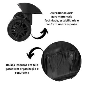 Com design moderno e acabamento elegante, conta com 4 rodas duplas com giro 360º, que garantem mobilidade leve e silenciosa em qualquer direção. A alça retrátil com ajuste de altura e a alça de mão superior proporcionam praticidade no manuseio.