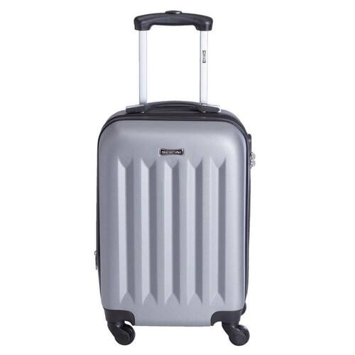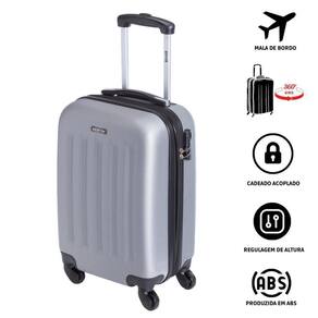Cor: Prata Marca: Sestini Material: ABS 4 rodas Carrinho embutido regulável Alça superior Textura microdiamante e fechadura Interior totalmente forrado em poliéster Cinta elástica cruzada e divisória com zíper Tamanho: pequena de Bordo