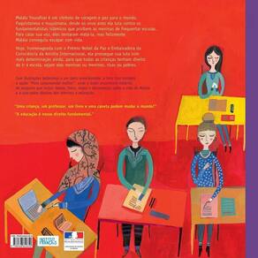 Uma criança, um professor, um livro e uma caneta podem mudar o mundo! Malala Yousafzai é símbolo de coragem e paz para o mundo. Paquistanesa e muçulmana, desde os onze anos, luta contra os fundamentalistas islâmicos do Talibã, que dominaram sua cidade e proibiram as meninas de frequentar escolas. Malala se recusou a aceitar a proibição e, por meio de um no da BBC de Londres, passou a denunciar a opressão do Talibã,ganhando notoriedade em seu país e, posteriormente, no mundo todo. Para tentar calar sua voz, os fundamentalistas tentaram assassiná-la, mas, felizmente, Malala conseguiu escapar com vida. Hoje, homenageada com o Prêmio Nobel da Paz e Embaixadora da Consciência da Anistia Internacional, ela prossegue sua luta com mais determinação ainda, para que todas as crianças tenham direito de ir à escola, sejam meninos ou meninas, ricas ou pobres. Com ilustrações belíssimas e um texto emocionante, as autoras contam a história dessa jovem mulher, exemplo de caráter e dignidade, e inspiração para todos os povos de todas as raças e crenças. Da mesma série de Mandela e Martin e Rosa, amplamente adotados nas escolas brasileiras, o livro conta com a seção “Para compreender melhor”, em que o leitor encontrará material de pesquisa que inclui textos, fotos, mapa e documentos sobre a vida de Malala.