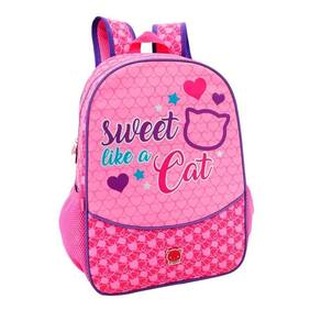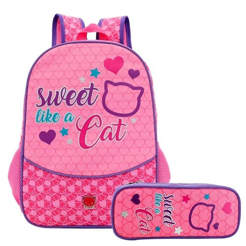 A Mochila escolar Be Happy é confeccionada com o mais alto padrão de qualidade e com costura reforçada para garantir a durabilidade. Com cores alegres e vivas, tem a frase estampada: Sweet Like a Cat (Doce como um Gato)