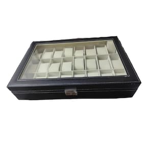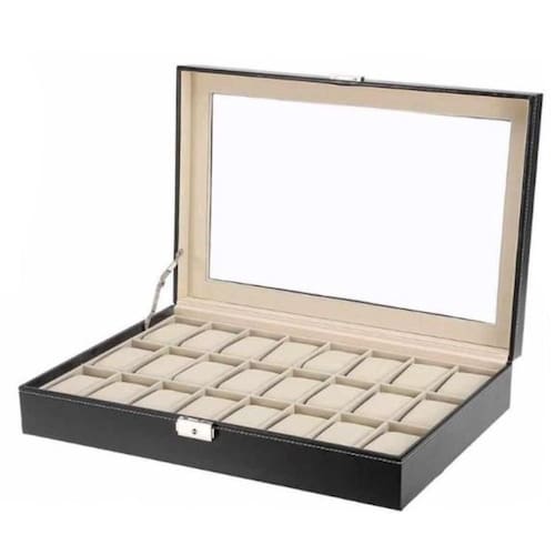 Maleta para 24 Relógios em Material Ecológico Preto com Tampa de Vidro e Interior Nude