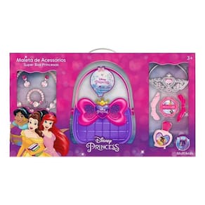Esse super conjunto acompanha uma Maleta totalmente personalizada com as cores das princesas Disney, com compartimento para armazenar os acessórios inclusos ou outros pequenos brinquedos. Perfeita para levar a magia das princesas para onde quiser Inclui 9 lindos acessórios de princesa como tiara, presilhas, colar e pulseiras que deixarão a brincadeira do faz de conta ainda mais real