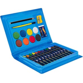 A maleta contém 24 peças, incluindo 12 pastilhas de aquarela, 8 gizes de cera, 1 pincel, 1 apontador, 1 borracha e 1 lápis grafite.