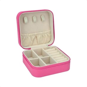 o mini porta jóias maleta 14 compartimentos aveludado caixa cor rosa da marca expresso modas é perfeito para organizar suas jóias de forma prática e elegante. Com 14 compartimentos espaçosos, você terá espaço suficiente para guardar até 40 peças. Feito com couro sintético resistente no exterior e forro aveludado no interior, este estojo é ideal para viagens ou para uso diário. Com fechadura para maior segurança e zíper para facilitar o acesso, este porta jóias é uma ótima opção para manter suas jóias sempre protegidas e organizadas. Seja bem vindo você chegou em uma equipe especializada para melhor te atender. Todas as fotos são de produtos reais e de exclusividade da nossa loja, sendo assim apenas nós temos o direito de imagem sob qualquer mercadoria anunciada. Veja nossos outros produtos um pouco mais abaixo em mais anúncios do vendedor. Você chegou até aqui se você tem alguma dúvida pendente sobre o produto anunciado nos diga. Estamos sempre aqui para lhe responder sempre
