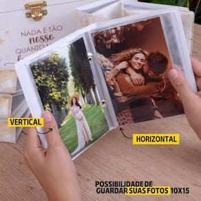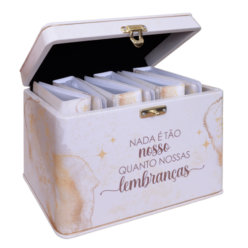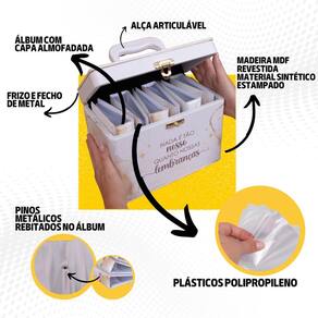 _ Maleta em MDF revestida com material sintético, com alça também revestida e fechamento em metal; _ Acompanha 6 álbuns com capa almofadada em material sintético com 50 folhas plásticas, comportando 100 fotos 10x15 cada álbum; _ Capacidade total de 600 fotos 10x15 na Box; _ Plásticos já inclusos rebitados no álbum com pinos metálicos (não é possível inserir mais folhas).