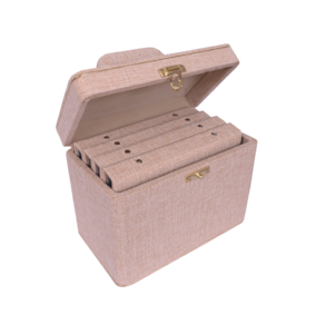- Maleta em MDF revestida com juta e alça revestida e fechamento em metal.