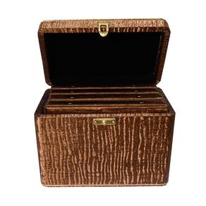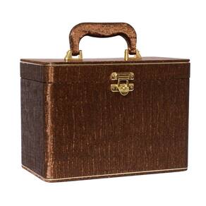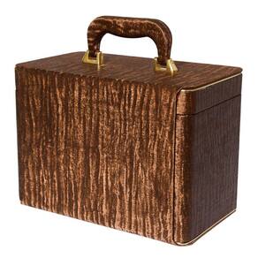 - Maleta em MDF revestida com tecido e alça revestida e fechamento em metal.