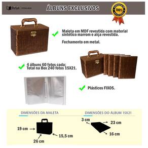 - Acompanha 4 álbuns com capa almofadada em tecido com 30 folhas plásticas, comportando 60 fotos 15x21 cada