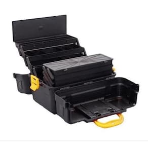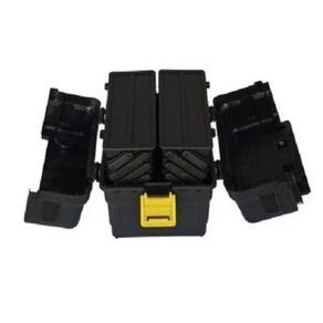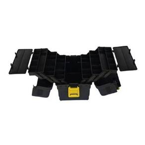 - Caixa com 06 bandejas articuladas - com tampas nas bandejas superiores - Material: Polipropileno - Peso: 1,1 kg - Cor: Pretas/Tampa Preta - 05 Compartimentos repartições em cada bandeja - 30 Divisórias total - 5 L espaço interno livre