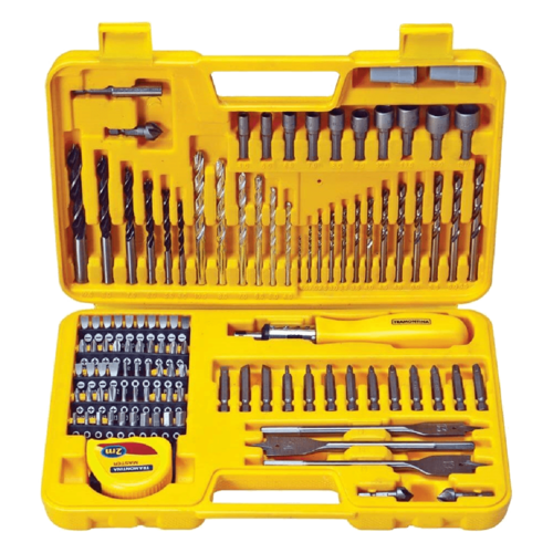 - Composição: 13 brocas HSS: 1.5, 2, 2.5, 3, 3.2, 3.5, 4, 4.5, 4.8, 5, 5.5, 6 e 6.5mm; 6 brocas para madeira: 4, 5, 6, 7, 8 e 10mm; 3 brocas para madeira ponta chata: 13, 16 e 19mm; 6 brocas para concreto: 4, 5, 6, 7, 8 e 10mm; 50 ponteiras com comprimento 25mm sendo 3 ponteiras cruzadas tipo pozidrive tamanhos PZ1, PZ2 e PZ3; 6 ponteiras tipo trafix tamanhos T10, T15, T20, T25, T27 e T30; 14 ponteiras ponta cruzada tamanhos PH0, PH1, PH2 e PH3; 10 ponteiras hexagonais tamanhos 3, 4, 5, 6 e 7mm; 3 ponteiras quadradas tamanhos S1, S2 e S3; 14ponteiras ponta chata tamanhos 6, 8, 10 e 12mm; 13 ponteiras com comprimento 50mm sendo 3 ponteiras chatas tamanhos 6, 8 e 10mm; 3 ponteiras tipo trafix T10, T15 e T20; 7 ponteiras tipo fenda cruzada tamanhos PH1, PH2 e PH3; 10 ponteiras tipo soquete tamanhos 4, 5, 6, 7, 8, 9, 10, 11, 12 e 13mm; 3 escareadores; 1 suporte magnético para ponteiras; 1 trena 2m; 1 chave com efeito catraca para as ponteiras; 2 guias para ponteiras; maleta plástica.
