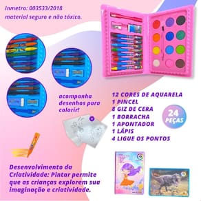 Especificações técnicas: - Conteúdo da embalagem: 1 maleta de pintura infantil que contém: 6 giz de cera, 12 cores de aquarela, 4 ligue os pontos, apontador, borracha, pincel e lápis. - Dimensões aproximadas: Largura: 11,5 cm, Comprimento: 17 cm. - Material: plástico. - Idade recomendada: Recomendável para crianças maiores de 3 anos. - Certificado pelo Inmetro: 003533/2018.