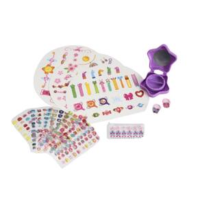 Recomendado para crianças maiores de 5 anos, esse brinquedo inclui adesivos para unha, adesivos para pele, adesivo com strass e vários acessórios.