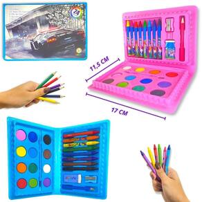 O que você vai receber em sua casa conteúdo da embalagem : - 1 maleta de pintura infantil que contém: 6 giz de cera, 12 cores de aquarela, 4 ligue os pontos, apontador, borracha, pincel e lápis.