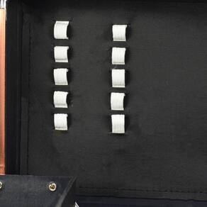 Possui 5 suportes de elástico para guardar pincéis ou lápis de maquiagem;