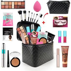 Além desse visual estiloso, a maleta lhe proporcionará total segurança no transporte, ela conta com um zíper super resistente que poderá ser aberta ou fechada por você a hora que quiser. Incrível não é mesmo descrição: 1- Base Efeito Matte Ruby Rose, Luisance ou Fenzza 1 - Pó Compacto no tom da Base ou Pó Translucido conforme disponibilidade em estoque 1- Paleta de Sombras e Blush12- Tons de Sombras 2- Batom Matte Líquido 1- Mascara de Cilios Luisance 1- Delineador Liquido Tango 1- Mascara de Cravos Black Head Pilaten 1- Primer Lágrimas de Unicórnio 8ml ou Máscara Ouro 1- Esponja Tipo Gota 1- Cílios Postiços 1- Kit Com 7 Pincéis Modelos podem variar conforme reposição 1- Necessaire Cortesia da loja 1- Maleta para armazenar maquiagens/bijuterias