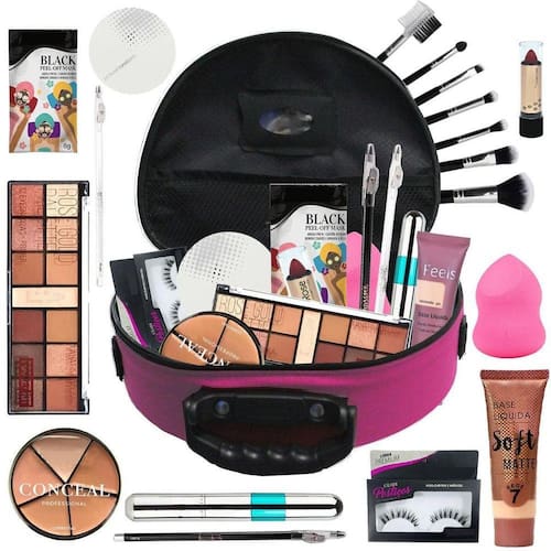 1 - lápis de olho branco; 1 - base líquida; 1 - pó translucido; 5 - cores decorretivos; 1 - mascara de cravos black head pilatens (cortesia da loja); 1 - mascara para cílios; 1 - esponja de gota; 1 - par de cílios; 1 - batom matte luxo; 1 - pincel duo pente e escova para cílios e sobrancelhas; 1 pincel para sombra (espuma); 1 pincel para sombra (cerdas); 1 pincel para pós ou blush; 1 pincel chanfrado para esfumar; 1 pincel aplicador de batom; 1 pincel escovinha 1 maleta frasqueira
