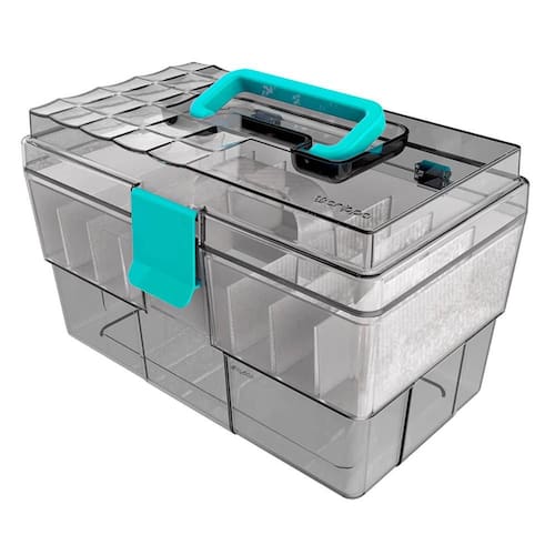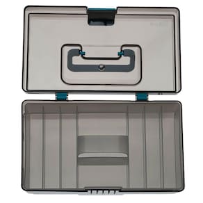 Garantia: 90 dias / Peso: 944g / Cores: fumê e azul turquesa / Referência: 401015040; Dimensões: 27,9cm (C) x 16,5cm (L) x 17cm (A); Conteúdo: 1 maleta organizadora multiuso; Materiais: polipropileno e policarbonato.