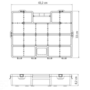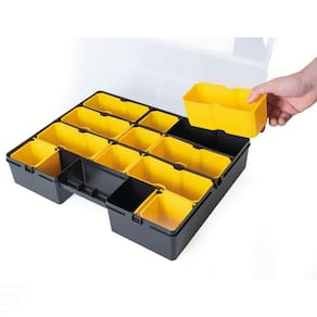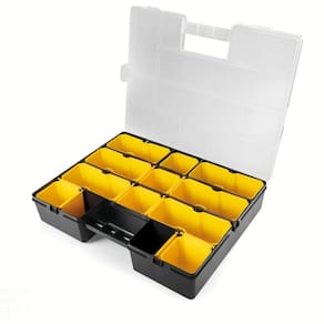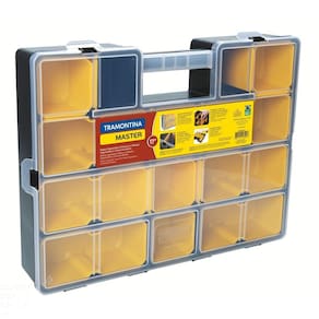 A Maleta Organizadora Plástica 17" Tramontina com Módulos Organizadores e Divisórias Móveis vai deixar suas ferramentas mais organizadas e fáceis de transportar! Produzida em plástico, possui divisórias e organizadores que facilitam o transporte e armazenamento. Além de ferramentas, ela é ótima para guardar artigos de pesca, entre outros acessórios. Um produto funcional que serve para deixar seus objetos em ordem. Orientações Corpo e divisórias móveis injetadas em polímero de alta resistência; 8 divisórias móveis que possibilitam a personalização do espaço interno da maleta; 5 módulos organizadores simples; 6 módulos organizadores duplos; Tampa transparente com reforços que aumentam sua resistência; 4 Travas para fechamento seguro (2 frontais e 2 laterais); Projetada para fácil personalização e portabilidade; Possibilita encaixar martelo de tamanho pequeno e médio; Características Gerais EAN13 7891114164947 DUN14 17891114164944 NCM 3923.10.90 Peso Líquido 1,7700 kg. Peso Bruto 2,0400 kg. Metragem 0,014537 m³. Dimensões Embalagem (Compr. X Larg. X Alt.) 455x 355x 90 mm. Dimensões Produto (Compr. X Larg. X Alt.) 455x 355x 9 mm. Observações Sempre utilizar óculos de segurança para proteger os olhos. Utilizar luvas para proteger as mãos. Não sobrecarregar as caixas de ferramentas com peso excessivo. Sempre manter as caixas trancadas durante sua movimentação ou transporte. Não apoiar peças sobre as caixas para realizar qualquer trabalho. As caixas são submetidas a testes de aplicação prática para garantir sua resistência durante o uso.