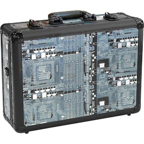 Destaques e diferenciaisPossui estrutura rígida revestida externamente em alumínio, com estampa imitando placa eletrônica, além de cantos em aço e laterais reforçadas com cantoneira de alumínio, ambos na cor preta, conferindo maior durabilidade. Revestida internamente com material sintético macio (EVA), com 5 divisões internas removíveis e ajustáveis que adequam-se a diferentes tamanhos e formatos de ferramentas. Acompanha porta-ferramentas removível e alça auxiliar em nylon. Conta ainda com 2 fechos metálicos com chave e fivelas e dobradiças em aço.