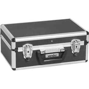 Produzida em alumínio com cantos plásticos e laterais reforçadas com cantoneiras de alumínio, conferindo maior durabilidade. Possui fechaduras e dobradiças metálicas com acabamento cromado e revestimento interno com material sintético macio (EVA). Conta com porta-ferramentas removível com 8 divisões.