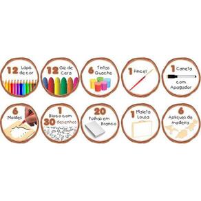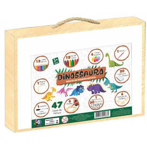 Uma maleta com tampa que vira lousa e com diversos materiais para o pequeno artista dar asas a imaginação. Na maleta a criança guarda todo o seu material ficando tudo organizado e é muito prática para levar a todo lugar.... Contém: 12 lápis de cor | 12 Giz de cera | 6 tintas guache | 1 pincel | 1 maleta lousa | 1 caneta com apagador | 6 moldes de dinossauro | 1 bloco com 30 desenhos | 6 apliques de madeira | 20 folhas em branco